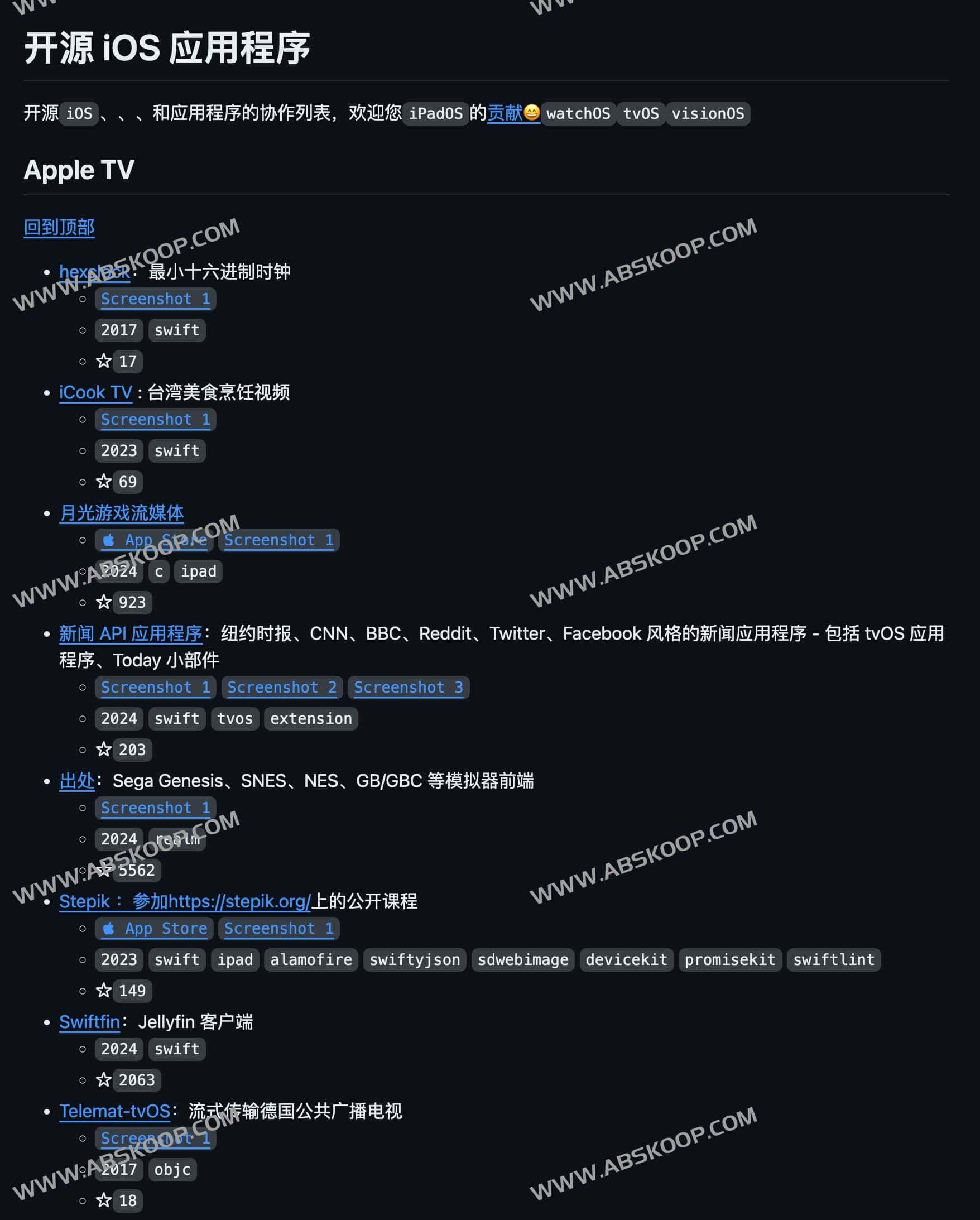 Open-Source iOS Apps是一个收集开源 iOS 应用程序的GitHub项目,收集更新iOS,、iPadOS,、watchOS,、tvOS、visionOS等等的开源app 信息 ,包括开源app的信息、介绍,开源地址、评分等等,想要 学习 开发 iOS应用的同学可以寻找相关的开源app学习。
