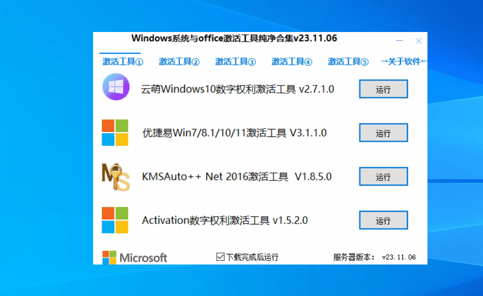 文件名称:Windows 系统与 Office 激活工具纯净合集_v23.11.06 绿色便捷版.rar