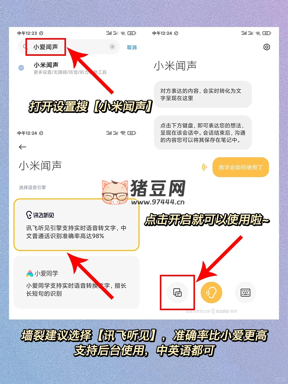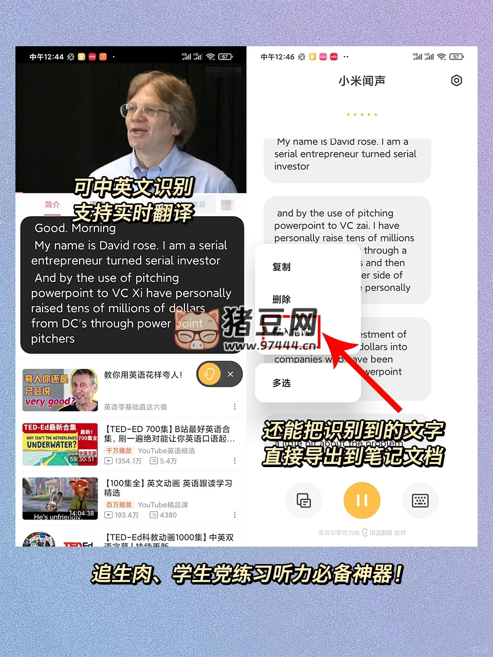 ③小米闻声:可实时识别语音(中英都可,还能实时翻译),并转换成文字,支持后台开启