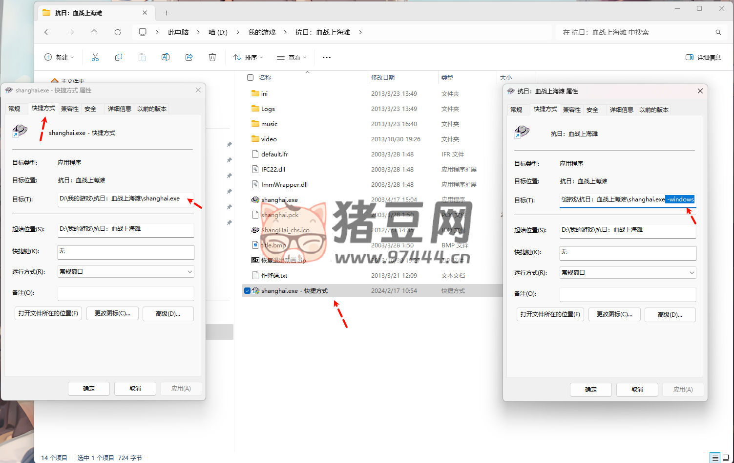 下载好游戏后,解压缩到文件夹内,然后需要对 shangh ai .exe 创建快捷方式,然后右键快捷方式,在目标地址后面加上:空格 - windows