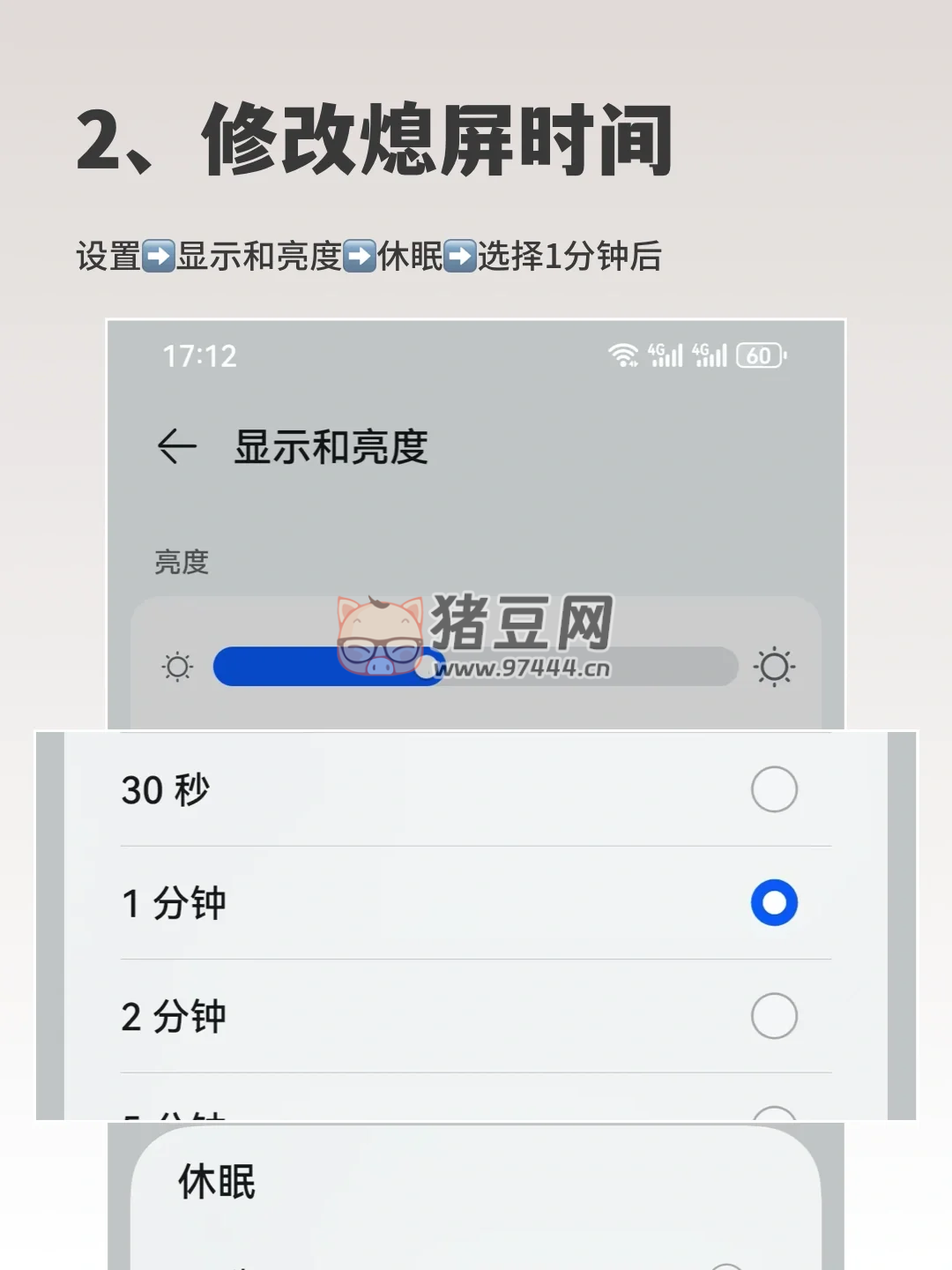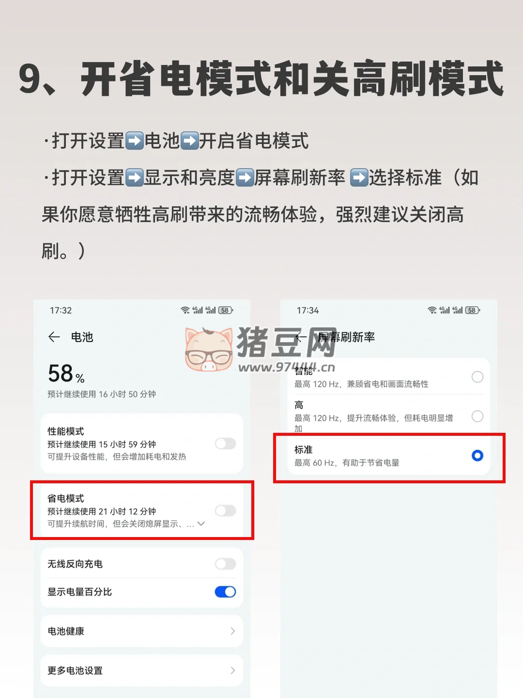 打开设置——电池——开启省电模式——打开设置——显示与亮度——屏幕刷新率——选择标准。