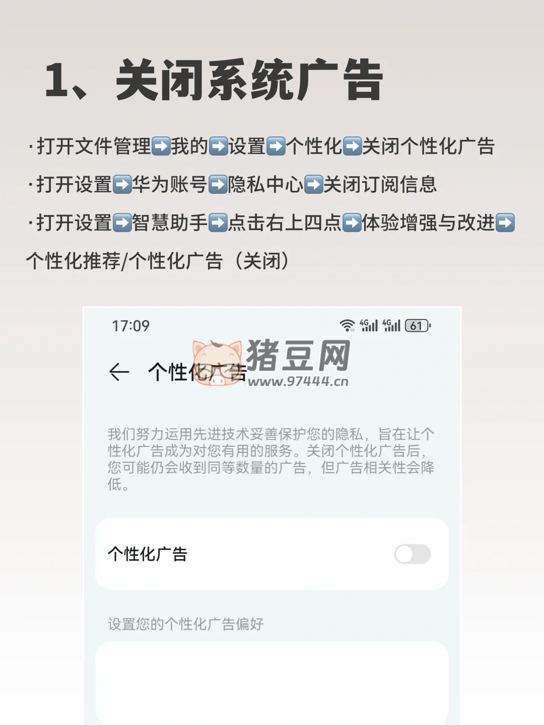打开文件 管理 ——我的——设置——个性化——关闭个性化广告——打开设置——华为账号——隐私中心——关闭订阅 信息 ——打开设置——智慧助手——点击右上四点——体验增强与改进——个性化推荐 / 个性化广告 (关闭)
